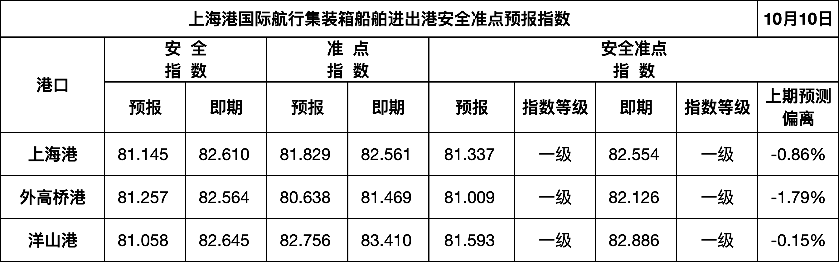 通过对上海港水域的预测通航环境、船舶预计抵港时间申报准确性(预计抵港准点率)、预测船舶航行动态等多维数据进行深入分析,形成进出港通航安全预报评价指标体系和准点预报评价规则,编制并发布上海港国际航行集装箱船舶进出港安全准点预报指数,并于每个工作日发布当天的预报指数结果(例如:10月17日发布10月17日的预报指数结果)和前一天的即期指数结果(例如:10月17日发布10月16日的即期指数结果)。