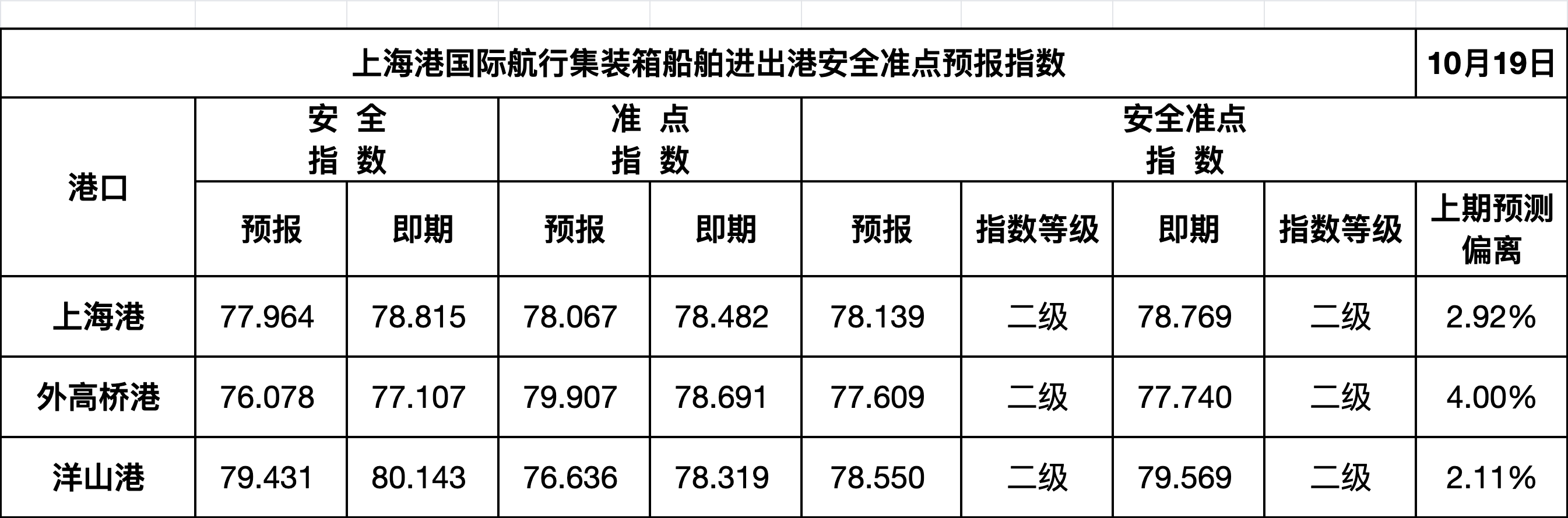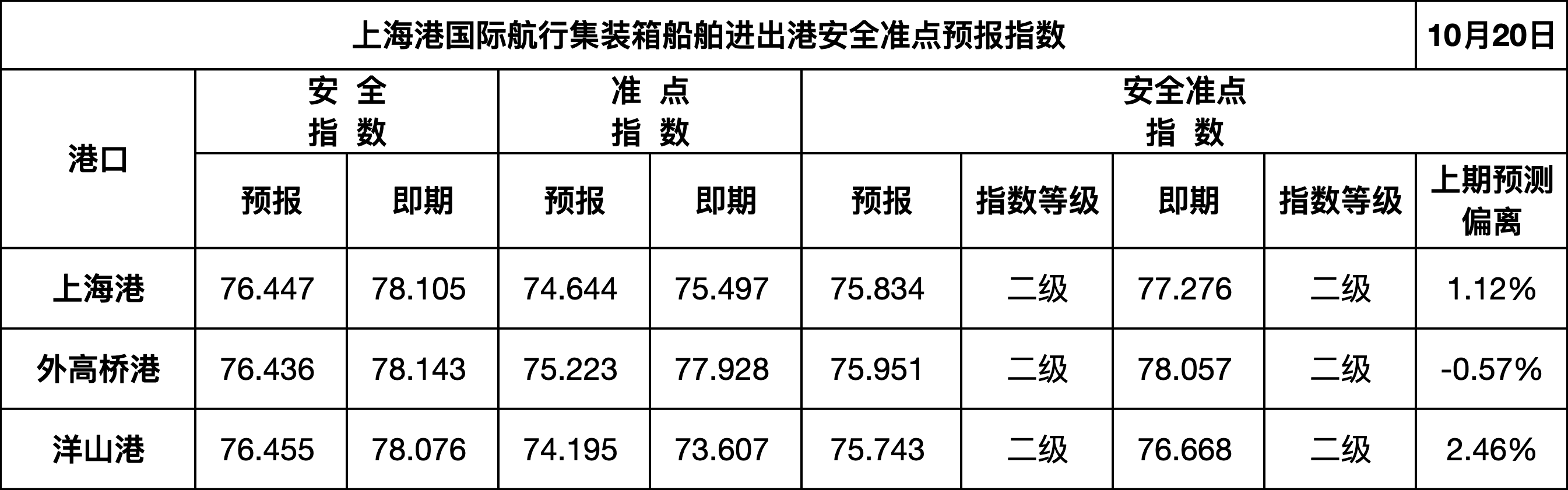 通过对上海港水域的预测通航环境、船舶预计抵港时间申报准确性(预计抵港准点率)、预测船舶航行动态等多维数据进行深入分析,形成进出港通航安全预报评价指标体系和准点预报评价规则,编制并发布上海港国际航行集装箱船舶进出港安全准点预报指数,并于每个工作日发布当天的预报指数结果(例如:10月17日发布10月17日的预报指数结果)和前一天的即期指数结果(例如:10月17日发布10月16日的即期指数结果)。