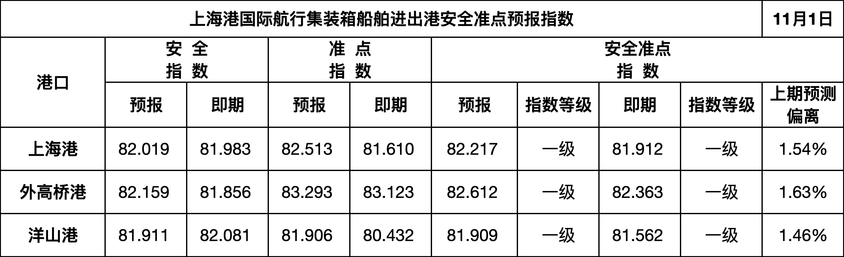 通过对上海港水域的预测通航环境、船舶预计抵港时间申报准确性(预计抵港准点率)、预测船舶航行动态等多维数据进行深入分析,形成进出港通航安全预报评价指标体系和准点预报评价规则,编制并发布上海港国际航行集装箱船舶进出港安全准点预报指数,并于每个工作日发布当天的预报指数结果(例如:10月17日发布10月17日的预报指数结果)和前一天的即期指数结果(例如:10月17日发布10月16日的即期指数结果)。