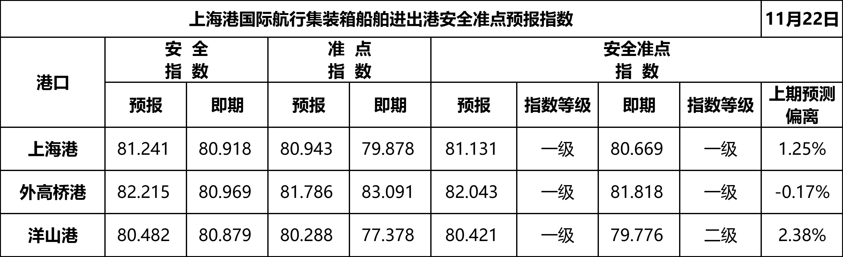 通过对上海港水域的预测通航环境、船舶预计抵港时间申报准确性(预计抵港准点率)、预测船舶航行动态等多维数据进行深入分析,形成进出港通航安全预报评价指标体系和准点预报评价规则,编制并发布上海港国际航行集装箱船舶进出港安全准点预报指数,并于每个工作日发布当天的预报指数结果(例如:10月17日发布10月17日的预报指数结果)和前一天的即期指数结果(例如:10月17日发布10月16日的即期指数结果)。