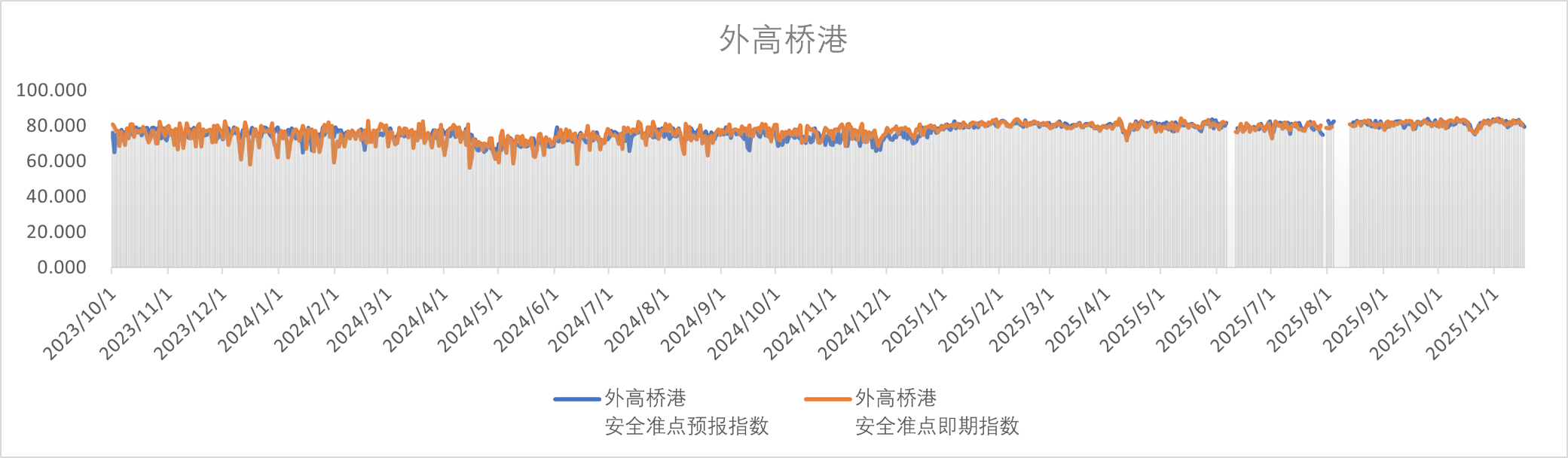 该指数运用AIS大数据技术,分析近十年上海港靠离泊作业准点情况和事故险情数据,从环境、船舶、航行、管理四个维度构建临近预报(Nowcasting)模型,评估与预报船舶进出港安全和靠离泊准点态势。