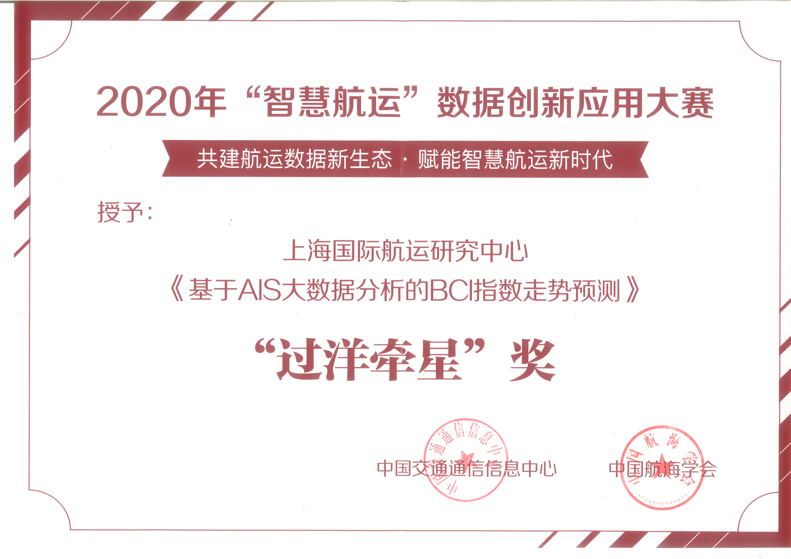 2020年,获中国交通通信信息中心、中国航海学会主办“智慧航运”数据创新应用大赛 “过洋牵星”奖 《基于AIS大数据分析的BCI指数走势预测》。