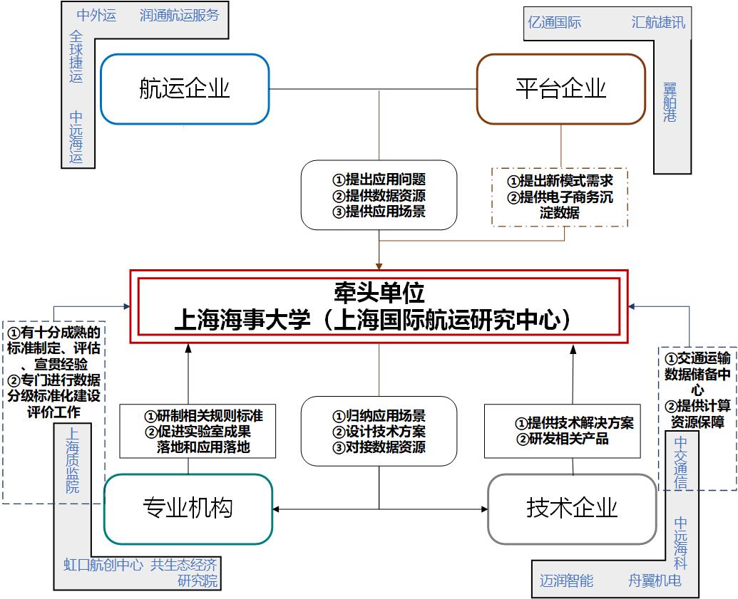 (2)中立方牵头融合链主企业跨界融合。将“物流”与“航运”数据跨界融合,实验室由经验丰富且中立的第三方机构研究中心作为牵头单位,联合航运和物流行业权重级链主企业共同建设,包括中国最大的货代企业中外运股份、交通部直属企业中交航信大数据、全球最大航运公司旗下中远海运科技、上海口岸最专业的数据公司亿通国际,以及E-Ports、全球捷运、运去哪、迈润科技等具有代表性的新兴数字化航运物流企业,融合各参建单位掌握的船、港、货、航线、业务等全链条数据集合,实现航运物流大数据“升维”价值。