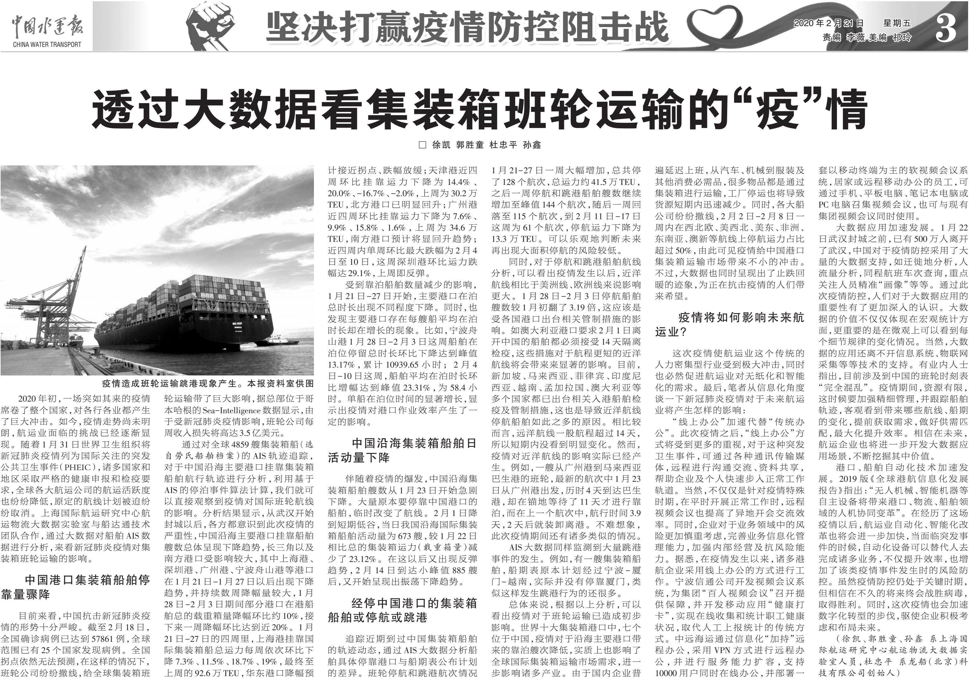 由徐凯、郭胜童、杜忠平、孙鑫共同发表《透过大数据看集装箱班轮运输的“疫”情》一文刊登在《中国水运报》上之后,受到国内外航运业的广泛关注,对于应用海量数据资源分析支撑市场异常情况分析的讨论成为热门话题。据不完全统计,路透社撰稿《China's top container ports unclog backlog as virus curbs ease》(随者疫情好转,中国主要集装箱港口的压港情况正在缓解)、韩国《海事信息网》(作为当日头条)、韩国《海运新闻网》、美国《Maritime Executive》、美国《纽约时报》、香港《南华早报》等数十家国际知名媒体报道引用了SISI对中国集装箱港口疫情期间跳港、停航事件的数据分析和市场进入复苏过程的判断结论,并报道了对徐凯博士的采访内容。