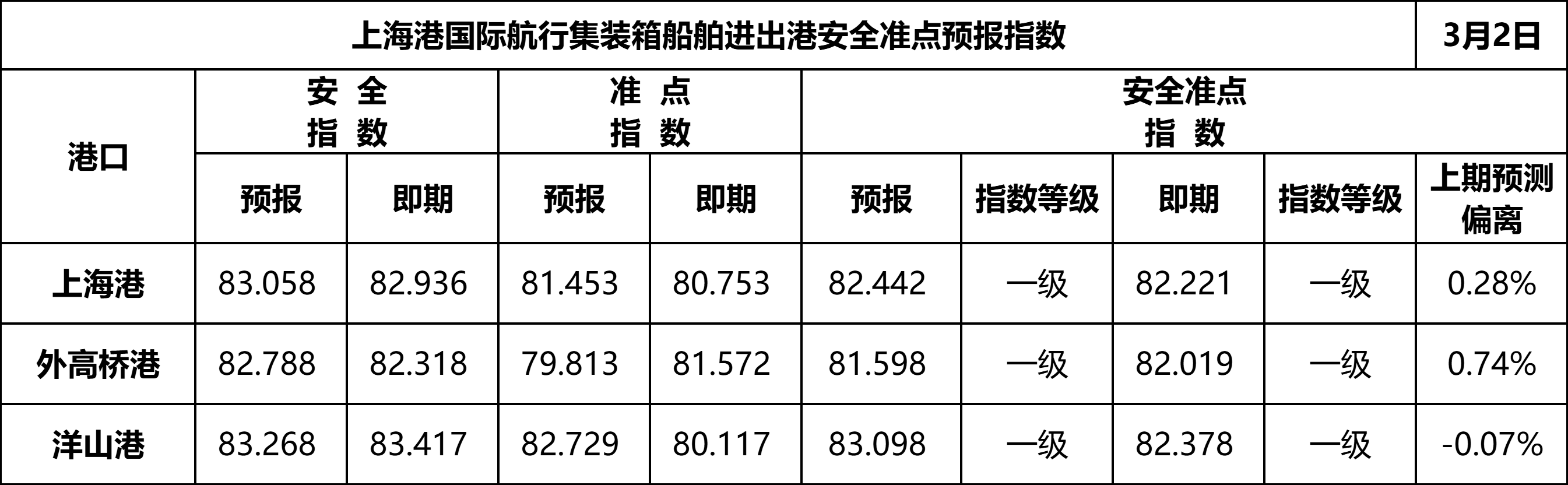 通过对上海港水域的预测通航环境、船舶预计抵港时间申报准确性(预计抵港准点率)、预测船舶航行动态等多维数据进行深入分析,形成进出港通航安全预报评价指标体系和准点预报评价规则,编制并发布上海港国际航行集装箱船舶进出港安全准点预报指数,并于每个工作日发布当天的预报指数结果(例如:10月17日发布10月17日的预报指数结果)和前一天的即期指数结果(例如:10月17日发布10月16日的即期指数结果)。