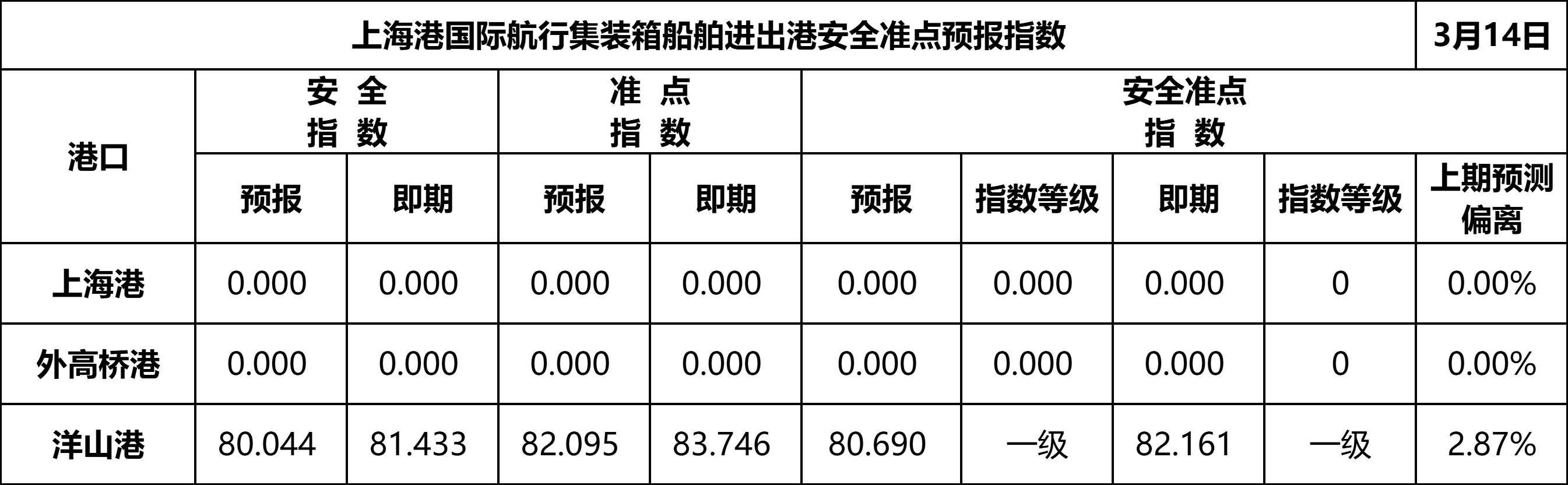 通过对上海港水域的预测通航环境、船舶预计抵港时间申报准确性(预计抵港准点率)、预测船舶航行动态等多维数据进行深入分析,形成进出港通航安全预报评价指标体系和准点预报评价规则,编制并发布上海港国际航行集装箱船舶进出港安全准点预报指数,并于每个工作日发布当天的预报指数结果(例如:10月17日发布10月17日的预报指数结果)和前一天的即期指数结果(例如:10月17日发布10月16日的即期指数结果)。
