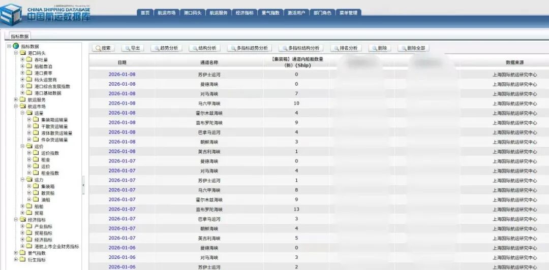 中国航运数据库是国内首创的整合国内外港航领域统计数据、信息资源的一站式公共服务平台。旨在为政府机关、航运企业、科研院校等各类用户提供便捷的查询和数据分析等功能的一站式数据服务。面向港航业提供包含航运市场、港口码头、航运服务、经济指标、景气指数5大板块指标数据。